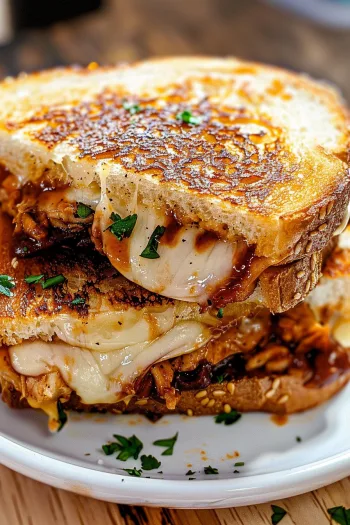 A mouthwatering grilled cheese sandwich loaded with tender BBQ chicken and melted cheese between crispy, golden bread for the ultimate comfort food experience.