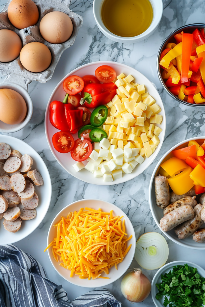 A great easy egg sausage casserole starts with fresh, simple ingredients. Knowing what to include ensures your casserole comes out flavorful, fluffy, and perfectly baked every time. Below is a guide to the essentials and optional add-ins to make this dish your own.