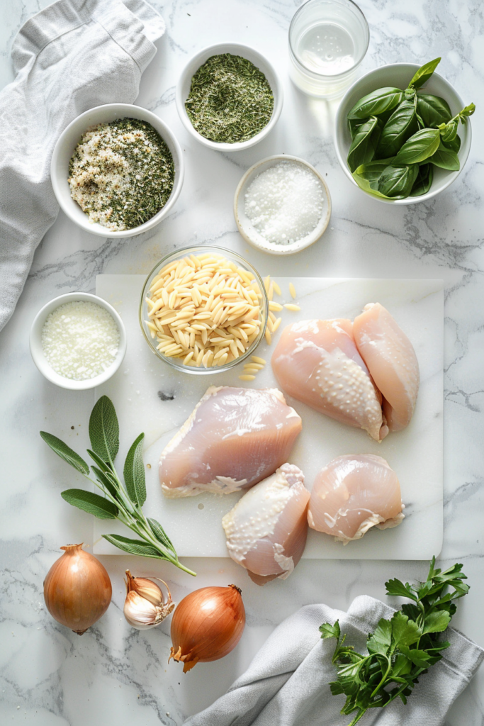 To make the ultimate French Onion Chicken Orzo Casserole, start with fresh, high-quality ingredients. The main components include: