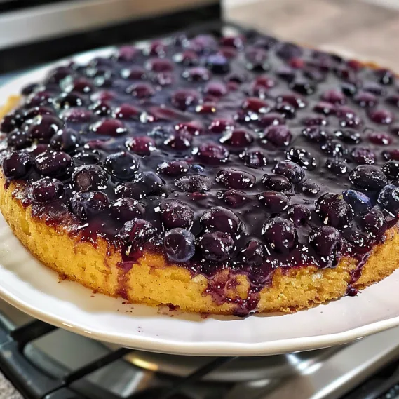 A stunning dessert featuring caramelized blueberries on top of a moist, buttery cake with hints of vanilla and lemon. Perfect for any occasion.