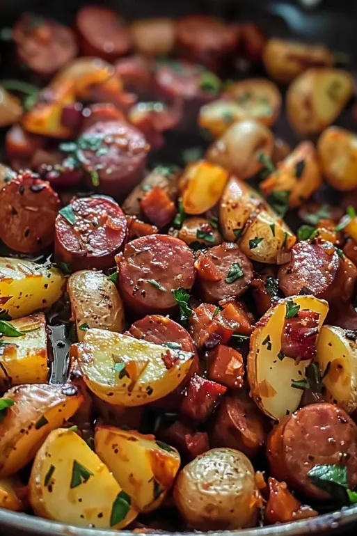 Place your halved potatoes on a large sheet pan and drizzle with olive oil. Sprinkle the seasonings over the potatoes and toss until they’re well coated. Arrange them cut-side down for maximum crispiness. Then, add the sliced kielbasa, bell peppers, and onions to the pan. Give everything another gentle toss to distribute the seasonings evenly. Slide the pan into your preheated oven and roast for twenty-five to thirty minutes. After fifteen minutes, remove the pan and stir everything around to promote even cooking. Return it to the oven until the potatoes are fork-tender and everything has developed a nice golden color.