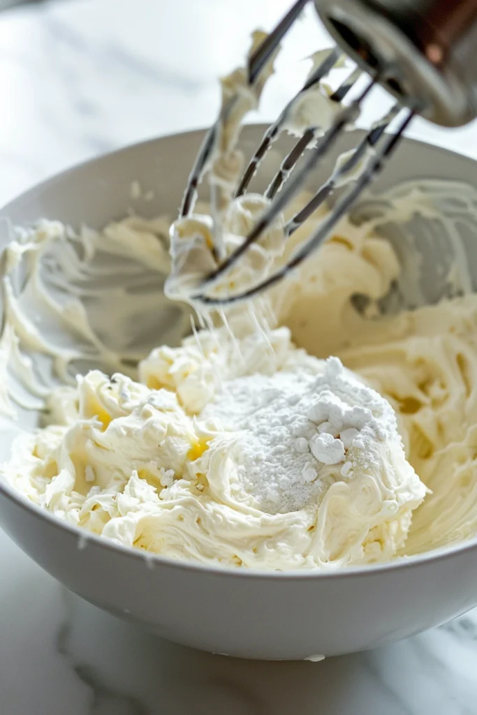 In a medium-sized bowl, beat the softened cream cheese with an electric mixer until it’s light and fluffy. Add the powdered sugar, vanilla extract, and flour, and mix until smooth and well-combined. This will create a creamy filling that holds its shape during baking.