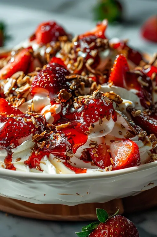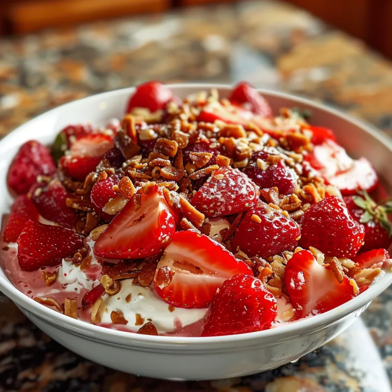 A delightful dessert salad featuring fresh strawberries layered with creamy filling and sweet, crunchy graham cracker topping. Perfect for potlucks and summer gatherings.